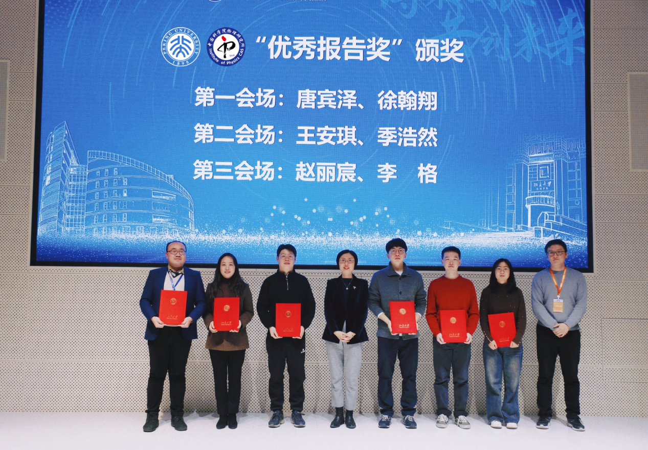 下午,优秀博士后代表报告由王宁宁主持,北大物理学院田野和物理所胡史奇作为优秀博士后代表分别作了题为“低维冰相的离子调控”和“High Harmonic Generation for Exploring Nonadiabatic Electron-Phonon Interactions in Solids”专题报告。随后会议进行了三个分会场的报告和交流,来自两家单位的29名博士后分享了各自的最新科研进展。与会人员与报告人进行了积极互动和探讨,现场评选出各分会场的最佳报告。北大物理学院唐宾泽、季浩然、赵丽宸和物理所徐翰翔、王安琪、李格等6名博士后荣获分会场“最佳报告奖”,北大物理学院赵清教授为获奖博士后颁发纪念证书。